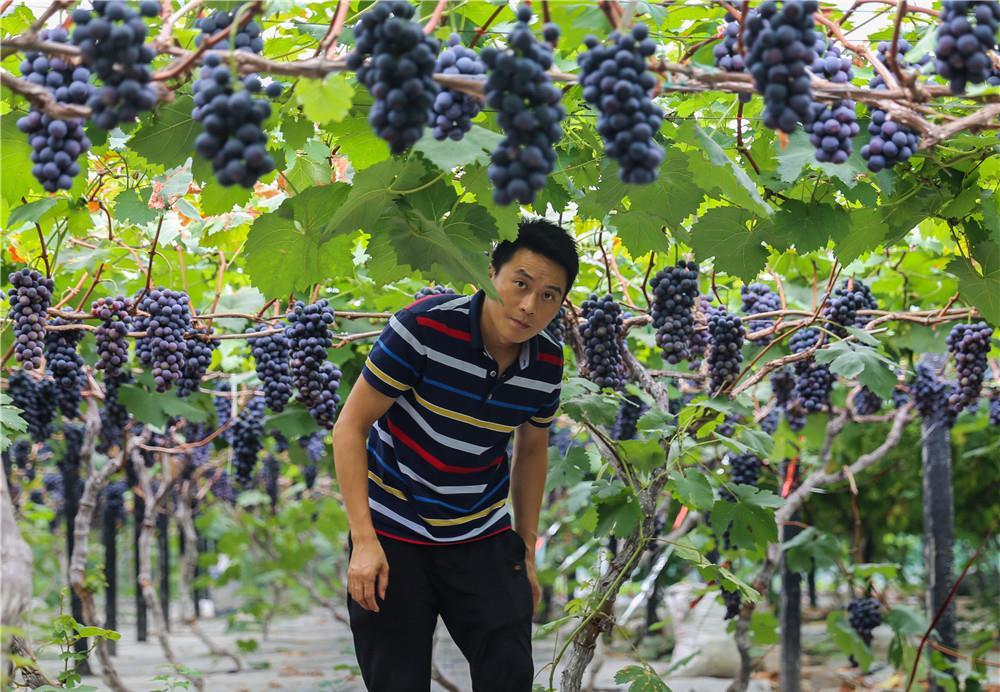在四川省眉山市彭山区果园村,张雄在查看葡萄长势(6月16日摄)。新华社记者 王曦 摄