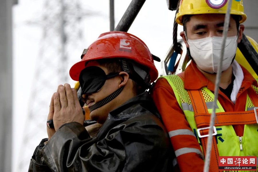 3人、3人、2人、2人,随着吊桶的一次次往返,被困人员陆续回到地面。最后一趟,一名获救矿工朝着掌声传来的方向,双手合十,表示感谢。