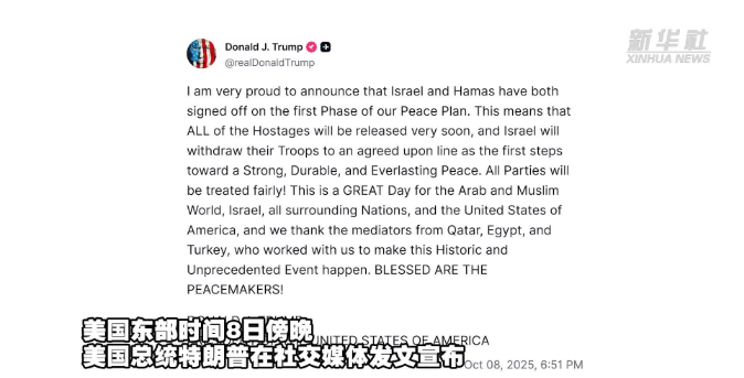 [国际] 特朗普称以色列与哈马斯就“和平计划”第一阶段达成协议