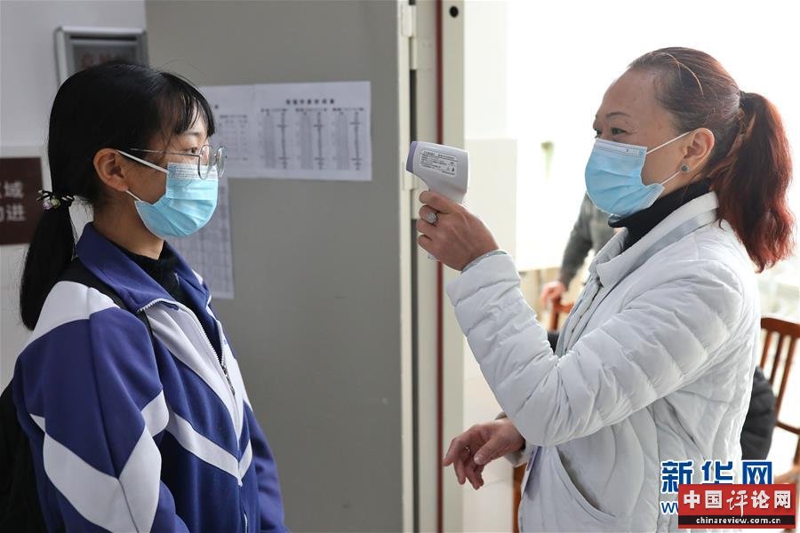 3月16日,贵阳市第六中学高三住校学生在进入宿舍前接受体温检测。 新华社记者 欧东衢 摄