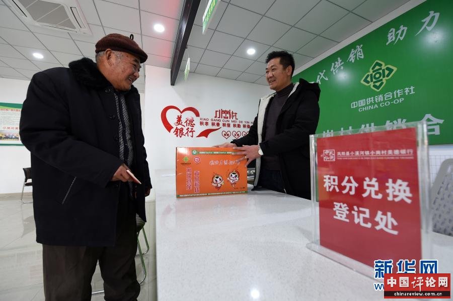 1月30日,在安徽省滁州市凤阳县小岗村,村民缪守鲁(左)在村里“美德银行”用积分兑换生活物品。新华社记者 周牧 摄