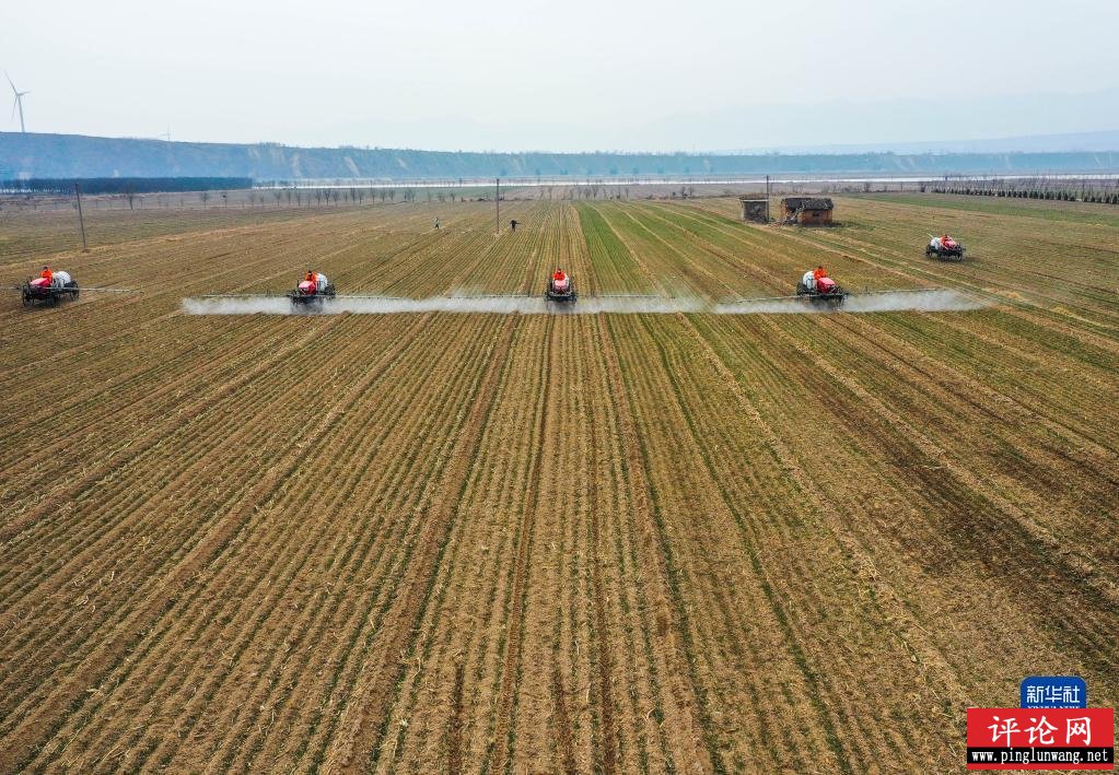 2月22日,高地隙植保机在山西省运城市芮城县新村作业(无人机照片)。新华社记者 柴婷 摄