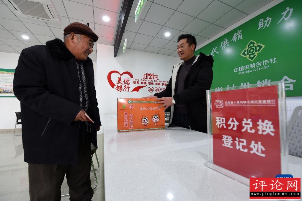 在安徽省滁州市凤阳县小岗村,村民缪守鲁(左)在村里“美德银行”用积分兑换生活物品(2021年1月30日摄)。新华社记者 周牧 摄
