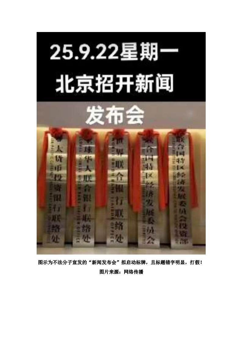 近期,我方发现有不法分子公然冒用“联合国特区经济发展委员会”“世界联合银行”“全球华人联合银行”“亚太货币投资银行”等机构名义,擅自组织召开所谓“新闻发布会”,发布虚假信息、误导社会公众,甚至可能借此实施诈骗等违法犯罪活动。此种行为严重侵犯了我方合法权益,扰乱了正常社会秩序,已涉嫌违法犯罪。对此,我方特作如下严正声明: