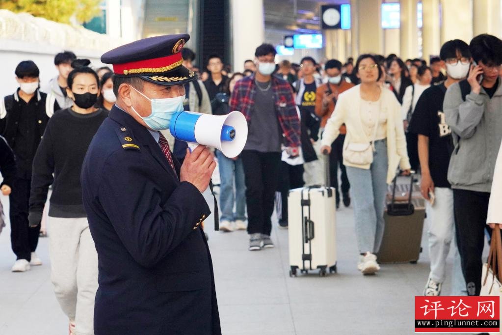 4月29日,淄博火车站工作人员在引导出站旅客。新华社发(刘炳友摄)