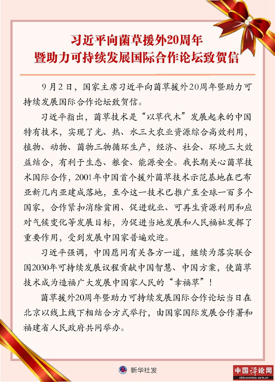 新华社北京9月2日电 9月2日,国家主席习近平向菌草援外20周年暨助力可持续发展国际合作论坛致贺信。