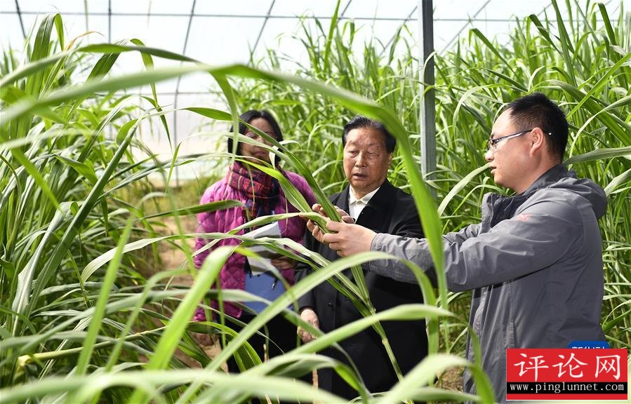 林占熺(中)在宁夏银川市永宁县闽宁镇农户刘昌富的大棚里查看菌草生长情况(2021年3月29日摄)。新华社记者 王鹏 摄