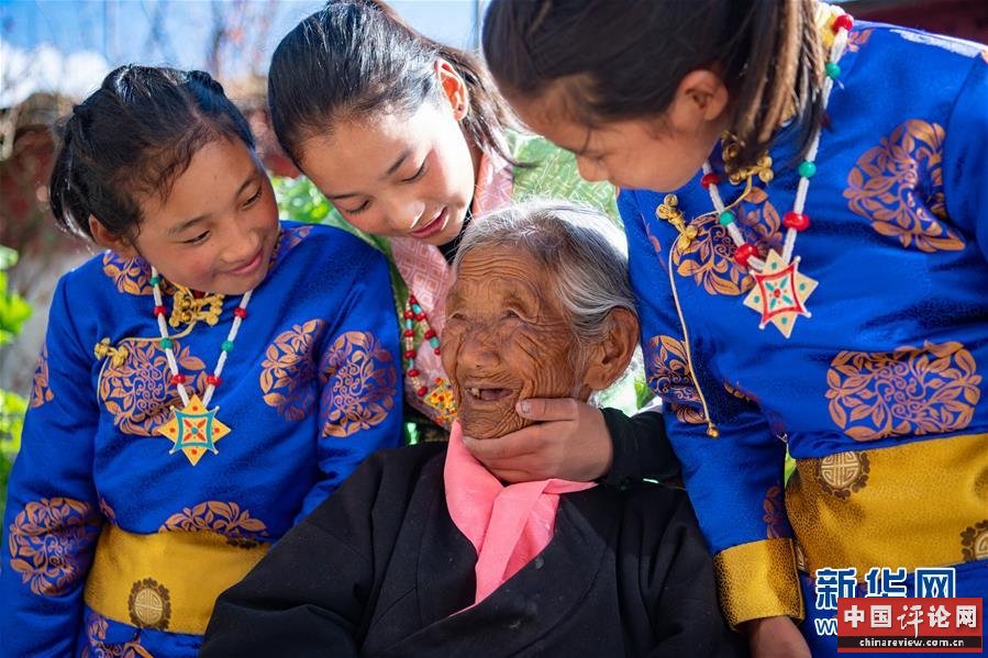 109岁的索朗卓玛和曾孙女旦增宗吉(右一)、旦增央吉(左一)、丹增曲吉在自家的院子里(3月24日摄)。新华社记者 普布扎西 摄