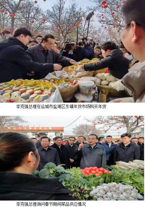 李克强总理在考察山西运城年货市场,强调要保供稳价,并用心购买了年货。在夏县庙前镇吴村范起山家中,询问了他家几亩地?收入多少?勉励他们脱贫以后不松懈、不止步。临行前,李克强把一份年货送到范起山手中:这是我在集市上买的,代表我个人的心意,祝我们年年有余、越来越好!在盐湖区圣惠片区棚户区居民孟树平家中,询问生活有什么不便?冬天取暖的问题等等。李克强总理叮嘱说:要顺应群众期盼,国家对棚户区和老旧小区改造会继续予以支持。出门前,总理把一份新年礼物送到孟树平手里,祝他家早日搬进新楼房,把”老日子”过成“新日子”,过上“好日子”。