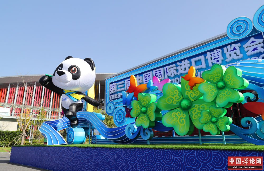 这是国家会展中心(上海)西入口处摆放的熊猫“进宝”主题进博会装饰(10月23日摄)。新华社记者 方喆 摄