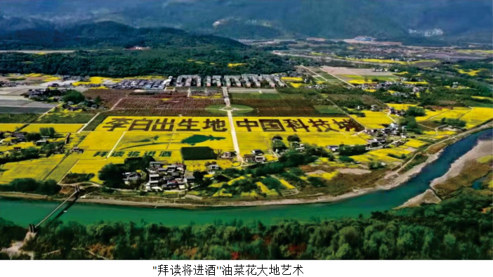 2007年,文创达人罗建国在江油小匡山李白读书台用油菜花与小麦创意种植的“千年李白.回归大地”及阳光三月“天宫看见李白家'',"拜读将进酒''等系列文创大地艺术作品,弘扬李白文化,让世界感知李白故里的墨香、酒香,用李白文创“舞动”匡山。罗建国从油菜花大地艺术(2007)到数字诗篇(2025)的18年持续创作 用创意推动文化符号进化。