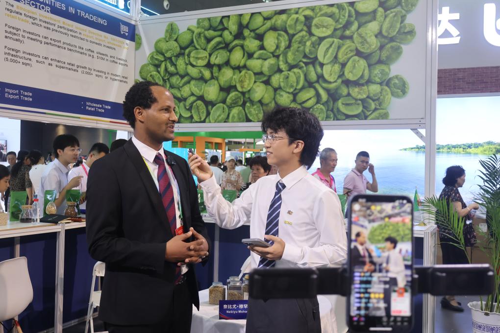 2025年6月14日,在第四届中国—非洲经贸博览会,埃塞驻华大使馆公使内比尤·穆罕默德进行线上直播。新华社记者 周昊瑾 摄