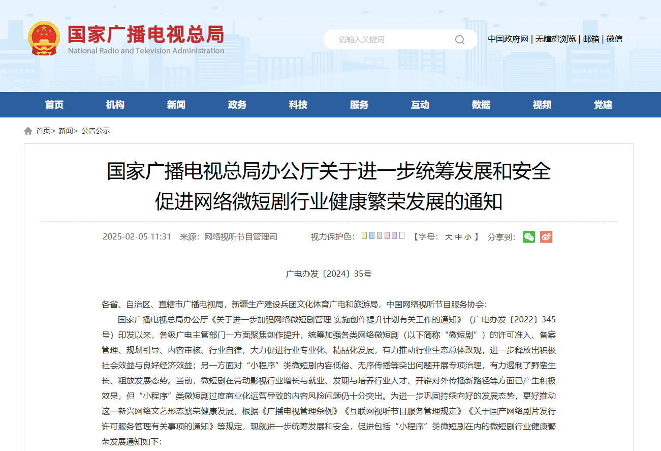 国家广播电视总局办公厅发布《关于进一步统筹发展和安全促进网络微短剧行业健康繁荣发展的通知》